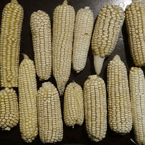“This is a little experiment of mine. I wanted a white dent corn which would be full-season in my region, but could only find seed for varieties which were too long-season for me. I wanted it to be as vigorous as possible. So in 2023 I obtained seed for eight white dents in the United States. Six of them tasseled and silked approximately simultaneously, and I crossed them all with each other. This is the result. Expect some variability for the first few years, and select for what works best in your conditions! “