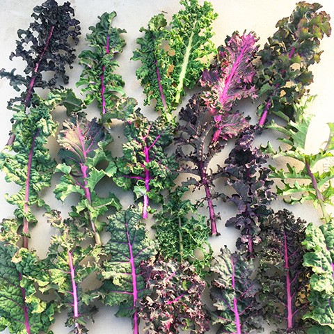 “The original ‘Dazzling Blue’ is a remarkable kale bred by Hank Keogh of Avoca Seed Farm in Oregon, who worked as a farmer for years with Frank Morton of Wild Garden Seeds and used some of Frank’s work as the basis for continued breeding. ‘Dazzling Blue’ has taken the seed and culinary worlds by storm, increasingly showing up at markets around the country due to its striking appearance and wonderful flavor. Now, meet Dazzling Blue’s most eccentric cousin, ‘Dazzling Texture’, selected by Hank from “off-types” within the ‘Dazzling Blue’ population. This mix has been selected for diversity in shape and type, with a mix of colors and rumpled crunchy frills. Some of this comes from a partial backcross of early Dazzling Blue “off-types” with ‘Purple Peacock’ Broccoli and an early side strain of Wild Garden Seeds’ Lacinato Rainbow Kale.”