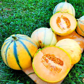 About 65 days in Corvallis Oregon. ‘Early Nirvana’, a dehybridization of Alvaro F1, is a very early organic-adapted Charentais-type melon with incredible flavor and texture. I named it for the powerful seductive aroma you can smell from 30’ away when the melon is ripe. Melons are up to about 5 inches in diameter. They ripen one at a time for an extended harvest over a period of about three weeks, with most plants having five or six melons. To harvest, cut melons and bring them indoors when the background between stripes just barely starts to turn yellow. Each melon announces its readiness to merge with a human, that is, be eaten, a few days later when the wonderful aroma develops and melons soften slightly to the touch. With a later planting, any melons unripe at the end of the season may be brought indoors, where most will ripen happily and produce prime melons indistinguishable in quality from those ripened on the vine, thus extending the harvest for two or three weeks beyond the first hard frost. Tolerates cool springs and summers and cold nights. Compared with Alvaro F1,‘Early Nirvana’ has a more intense flavor and aroma, a smoother firmer texture, and ripens its fruits one at a time for an extended harvest instead of all at once. OSSI-Pledged variety bred by Carol Deppe.