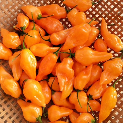 “Very Hot. 90-100 days. Orange Embers Habanero is the end result of 8 years of selecting an easy to grow, early to mature orange habanero with a moderate heat level that is easier to use in recipes. Ranging anywhere from a quarter to half as hot as a typical habanero, Orange Embers still retains all of the flavor and aromatic spice that habaneros should have. Short plants are great for containers and are loaded with small orange fruit which resemble embers. The heat is spicy, but not burn-your-face-off hot – more like the heat of smoldering embers than a raging fire. Orange Embers originated from a chance cross between a yellow Aji Limon and an orange hybrid habanero. This wide cross offered us the perfect opportunity to select several very different new peppers, including Limón Lightning. Perfect added to pickled carrots or for producing hot sauces with a tropical character. Expected Scoville Heat Unit (SHU) range: 25,000-50,000.”